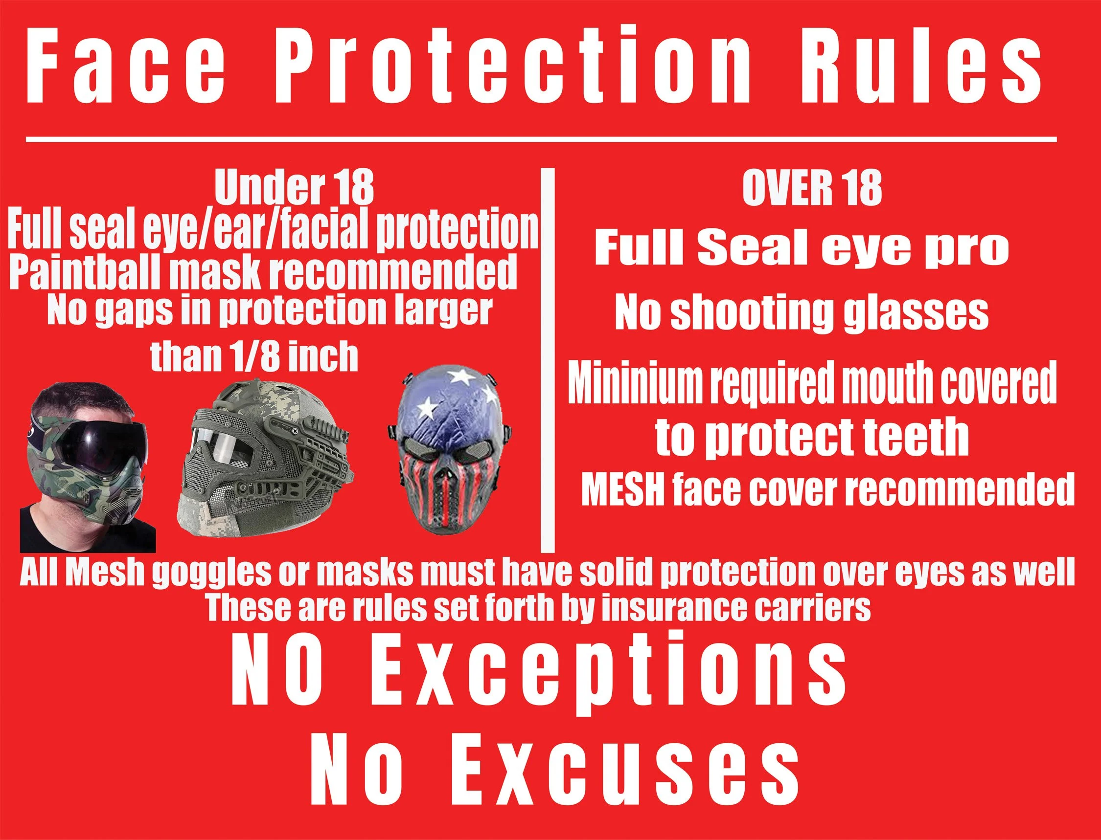 -All players under 18 years old must use full face mask with ASTM certified lenses- Any middle ground is up to the discretion of the ref.