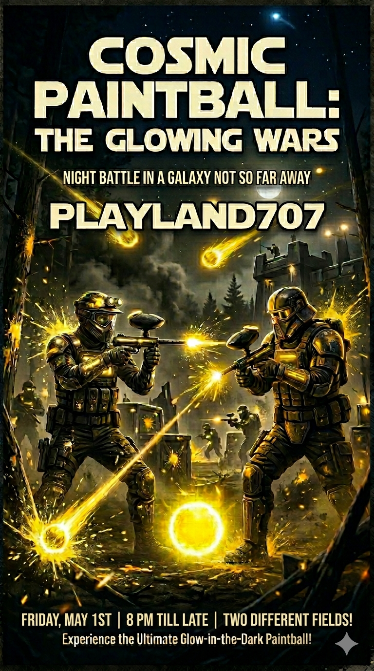 We will be offering cosmic/glow paintball starting May 1st and every friday through May!